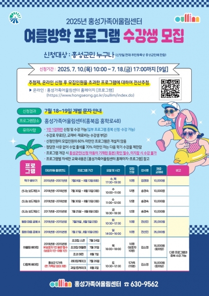 [충청25시] 홍성가족어울림센터는 오는 10일부터 18일까지 ‘여름방학 프로그램’ 수강생을 모집한다고 밝혔다.
