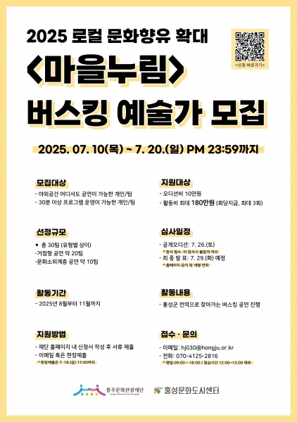 [충청25시] 홍주문화관광재단은 오는 20일까지 ‘2025 로컬 문화향유 확대 ‘마을누림’’ 거리예술가를 공개 모집한다.