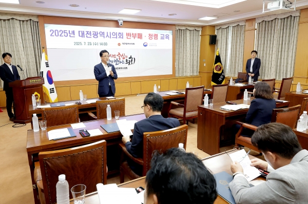 [충청25시] 대전시의회는 7월 23일 제288회 임시회 산회 후, 시의회 소통실에서 의원 및 의회사무처 직원을 대상으로 반부패 법령 중심의 청렴교육을 실시했다.