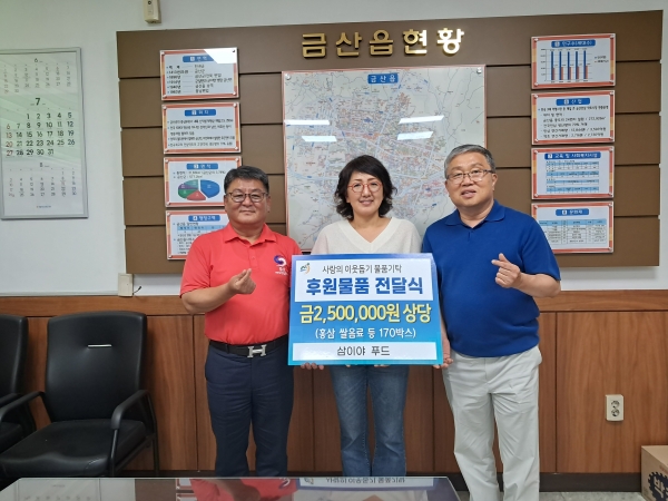[충청25시] 삼이야 푸드는 지난 23일 금산읍행정복지센터를 방문해 취약계층을 위해 250만원 상당 홍삼·쌀 음료 등 170세트를 기부했다이날 기부된 물품은 독거노인 등 어려운 이웃에 전달될 예정이다.