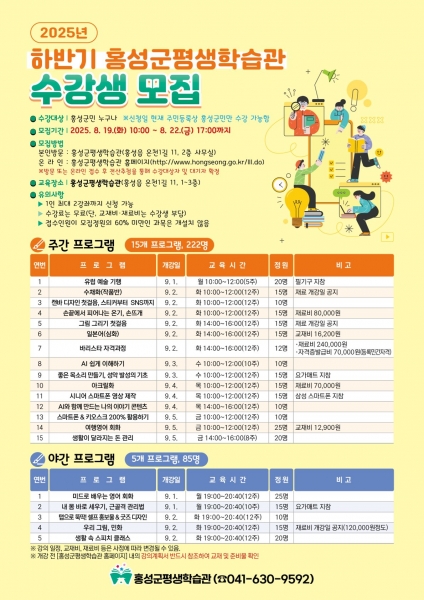 접수는 8월 19일 10시부터 22일 오후 5시까지이며 홍성군평생학습관과 신도시평생학습관 방문 접수 또는 홍성군평생학습관 홈페이지에서 온라인 신청이 가능하다.