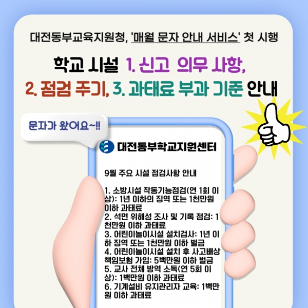 [충청25시] 대전동부교육지원청은 9월 4일부터 관내 교직원 270여명을 대상으로 학교 시설 주요 점검사항을 매월 사전에 발송하는 ‘문자 안내 서비스’를 처음으로 시행한다고 밝혔다.