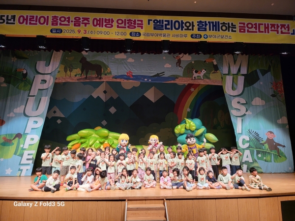 [충청25시] 부여군보건소는 지난 9월 3일 국립부여박물관 사비마루에서 관내 어린이집과 유치원생 360여명을 대상으로 흡연·음주 예방을 위한 뮤지컬 ‘엘리야와 함께하는 금연 대작전’ 공연을 진행했다.