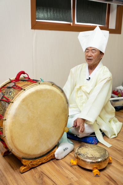 ‘앉은굿’은 법사가 의관을 정제한 뒤 자리에 앉아 북과 꽹과리를 치며 독경하는 의식으로 특히 이용구 보유자는 이 전통을 계승·보존한 공로를 인정받아 2020년 충청남도 무형유산 보유자로 지정됐다.