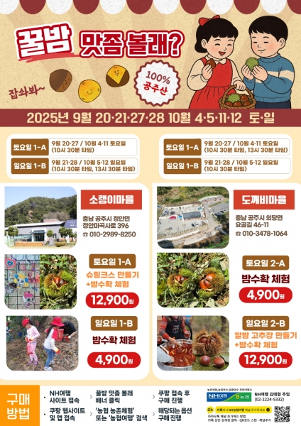 [충청25시] 공주시는 농협네트웍스와 협력해 농촌과 도시의 교류를 넓히고 지역 경제 활성화를 도모하는 ‘밤 줍기 체험 프로그램’을 오는 9월 20일부터 10월 12일까지 운영한다.