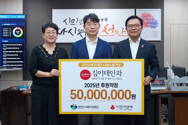 [충청25시] 천안시복지재단은 지난 8일 김이태 안과가 천안시청 부시장실에서 사회적 고립가구 지원을 위한 후원금 5,000만원을 약정했다고 밝혔다.