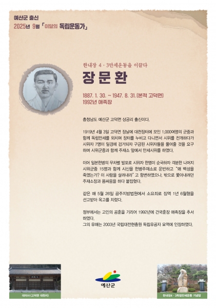 [충청25시] 예산군은 고덕면 상궁리 출신 장문환 독립운동가를 ‘2025년 9월 이달의 독립운동가’로 선정했다고 밝혔다.
