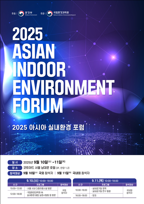 [충청25시] 환경부 소속 국립환경과학원은 9월 10일부터 이틀간 코트야드 메리어트 서울 남대문 호텔에서 ‘2025 아시아 실내환경 국제 토론회’를 개최한다고 밝혔다.