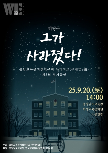 [충청25시] 충남교육청은 오는 9월 20일 오후 2시, 충청남도교육청학생교육문화원 소공연장에서 충남교육뮤지컬연구회 ‘무대WE路’의 제5회 정기 공연 ‘리딩극 그가 사라졌다’를 개최한다.
