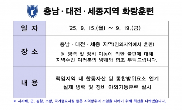 [충청25시] 천안시는 통합방위작전태세 확립을 위해 15일부터 19일까지 5일간 ‘2025 화랑훈련’을 실시한다.