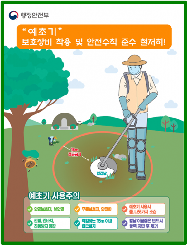 [충청25시] 행정안전부는 추석을 앞두고 벌초 등으로 예초기를 사용할 경우, 안전사고 예방에 각별한 주의를 당부했다.