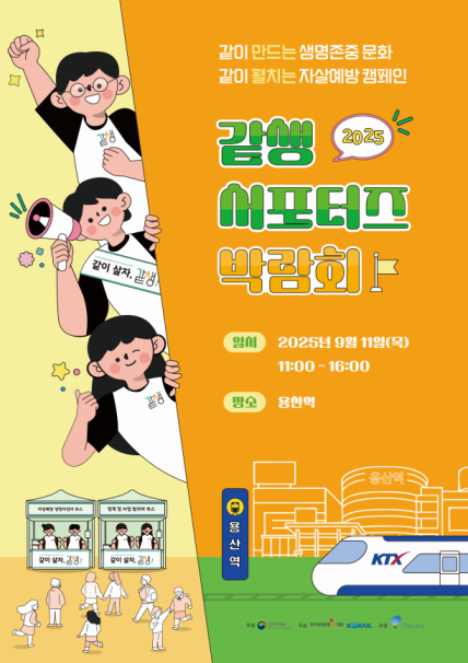이러한 일환 중의 하나로 보건복지부와 한국생명존중희망재단은 자살예방주간을 맞아 ‘자살예방의 날 기념행사, 플라자호텔)’에 이어 9월 11일 11:00~오후 4시 용산역에서 자살예방 및 생명존중문화 조성을 위한 ‘2025 같이 살자, 같생 서포터즈 박람회’를 개최한다.
