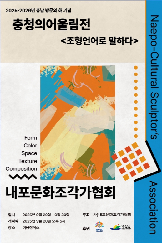 [충청25시] 예산군은 2025∼2026년 충남·예산 방문의 해와 내포문화조각가협회 창립 10주년을 기념하는 ‘2025년 충청의 어울림전’을 오는 9월 20일부터 30일까지 이음창작소에서 개최한다고 밝혔다.