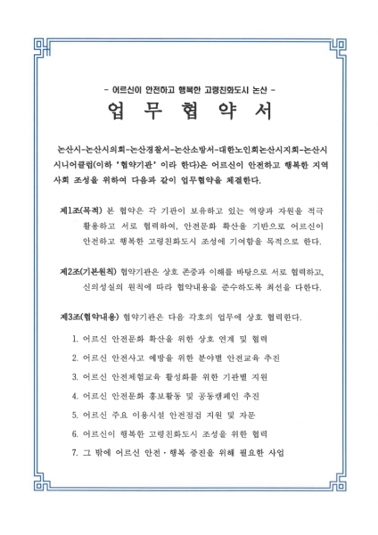 이들 기관은 전국적으로 증가하는 어르신 사고에 대응하고 고령친화도시 논산을 조성하기 위해 함께 협력해 나가기로 약속했다.