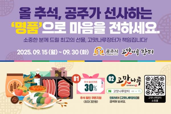 [충청25시] 공주시는 시가 직접 운영하는 농특산물 온라인 쇼핑몰 ‘고맛나루장터’에서 민족 최대 명절인 추석을 맞아 9월 15일부터 9월 30일까지 ‘추석맞이 기획전’을 진행한다고 밝혔다.