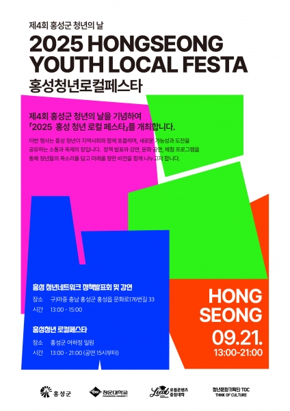 [충청25시] 홍성군은 법정기념일인 청년의 날을 맞아 오는 21일 오후 1시부터 오후 9시까지 군청 여하정 일원에서 ‘제4회 홍성 청년의 날 – 홍성청년 로컬페스타’를 개최한다고 밝혔다.