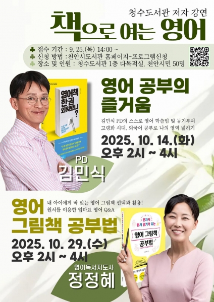 [충청25시] 천안청수도서관은 오는 10월 ‘책으로 여는 영어’ 강연을 운영한다고 밝혔다.