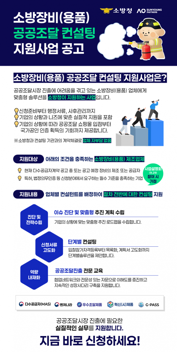 특히 소방청은 오는 9월 29일 오후 2시, 서울 용산 게이트웨이타워에서 사업설명회를 열고 사업 개요와 신청 절차, 공공조달시장 진출 전략을 안내한다.