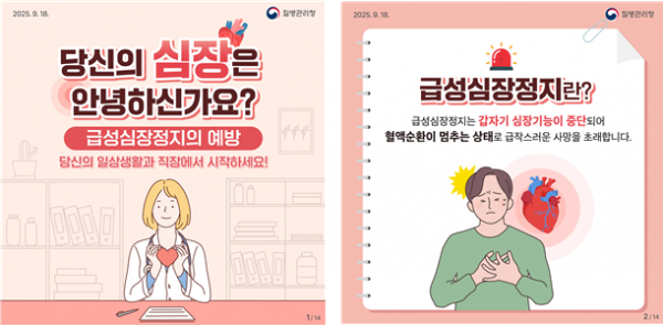 이에 연세대학교 원주세브란스병원 차경철 교수팀이 진행하고 있는 정책연구용역 ‘심장정지 발생원인 및 위험 요인 규명 추적조사’ 결과를 활용해, 심장 건강에 대한 경각심을 높이고 건강한 생활습관 정착을 유도하기 위해 카드 뉴스를 배포한다.