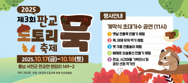 [충청25시] 서천군 판교면은 오는 10월 17일부터 18일까지 이틀간 판교전통시장 일원에서 ‘제3회 판교 도토리묵 축제’를 개최한다.