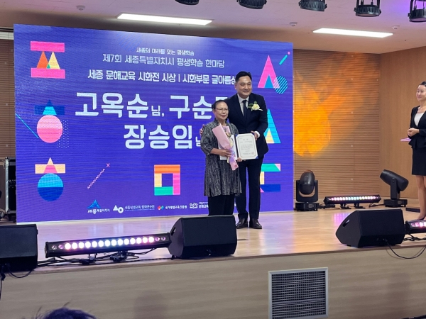 [충청25시] 세종시교육청평생교육학습관은 문해교육을 통해 배움의 기쁨을 알아가고 있는 구순덕어르신과 장승임어르신이 9월 18일에 보람종합복지센터 대강당에서 열린‘2025년 전국 성인문해교육 시화전 행사’에서 글아름상을 수상했다고 밝혔다.