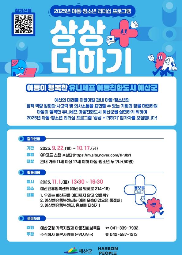 ‘상상+더하기 아동·청소년 리더십 프로그램’은 11월 1일 오후 1시 30분, 예산앤유행복센터에서 열릴 예정이며 참가자들은 아동친화도시에 대한 이해를 바탕으로 아이디어 발굴, 정책 제안 등 다양한 참여형 활동에 참여할 예정이다.