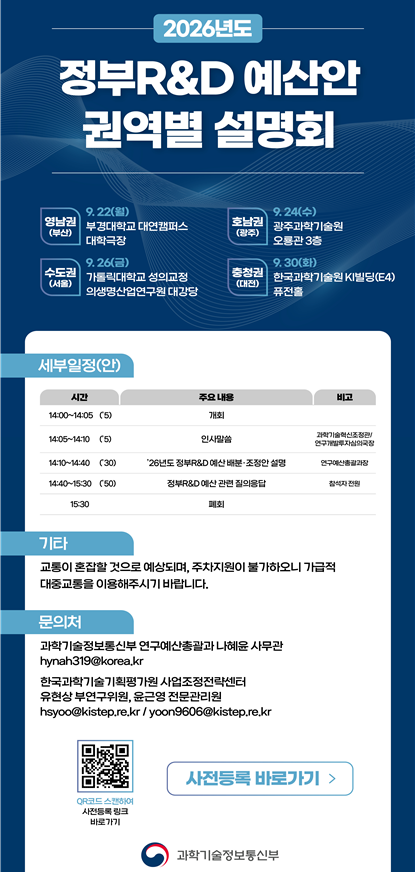 [충청25시] 과학기술정보통신부 과학기술혁신본부는 9월 22일부터 수도권, 충청권, 호남권, 영남권 등 4개 권역에서 2026년도 국가연구개발사업 예산안 권역별 설명회를 개최한다고 밝혔다.