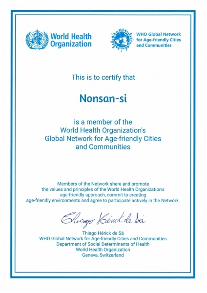 논산시는 2018년 전국 8번째이자 충청남도 최초로 WHO 고령친화도시 국제 네트워크에 가입했다.