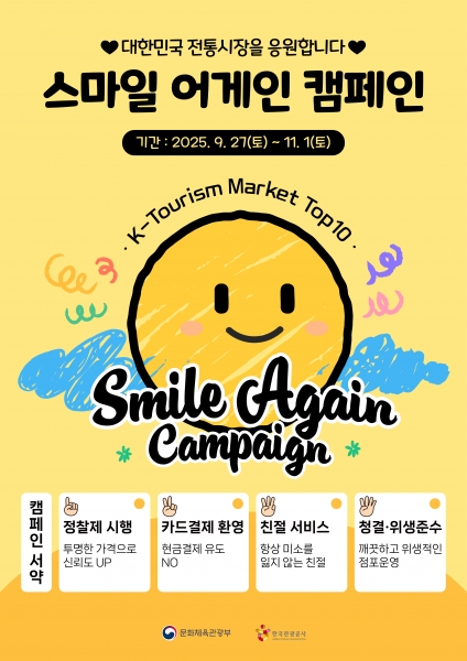 [충청25시] 문화체육관광부와 한국관광공사는 전국 전통시장에 활기를 불어넣고자 오는 27일부터 11월 1일까지 ‘2025 스마일 어게인 캠페인’을 전개한다.