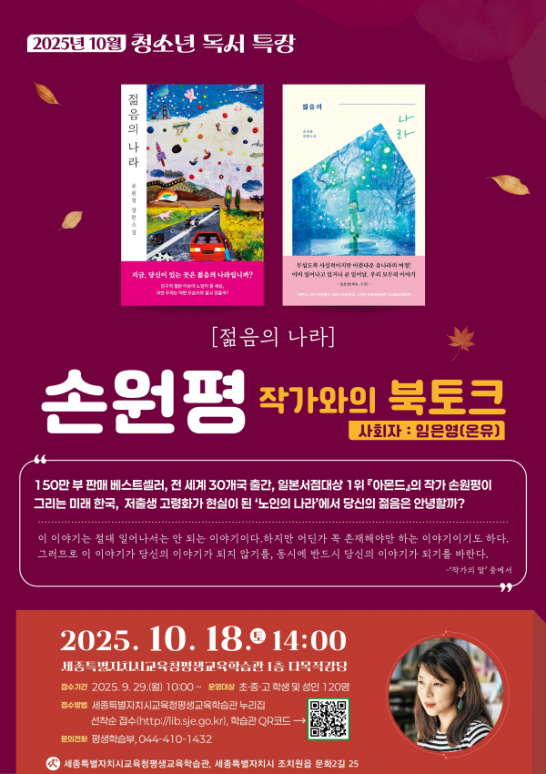 [충청25시]세종시교육청평생교육학습관(관장 김희경, 이하 평생교육학습관)이오는 10월 18일(토) 오후 2시, 소설가이자 영화감독인 손원평 작가를 초청해 책마당(북콘서트)를 개최한다.