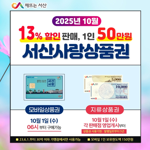 시는 서산사랑상품권 1인당 구매 한도를 기존 40만원에서 50만원으로 확대하며 총 150억원 규모로 발행한다.