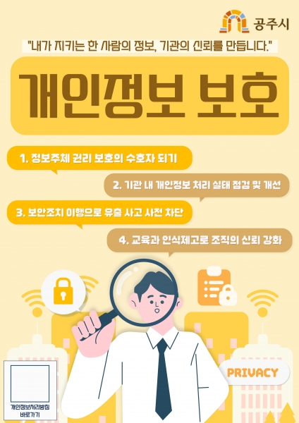 [충청25시] 공주시는 ‘개인정보 보호의 날’을 맞아 9월 29일부터 10월 3일까지를 개인정보 보호주간으로 정해 운영한다고 밝혔다.