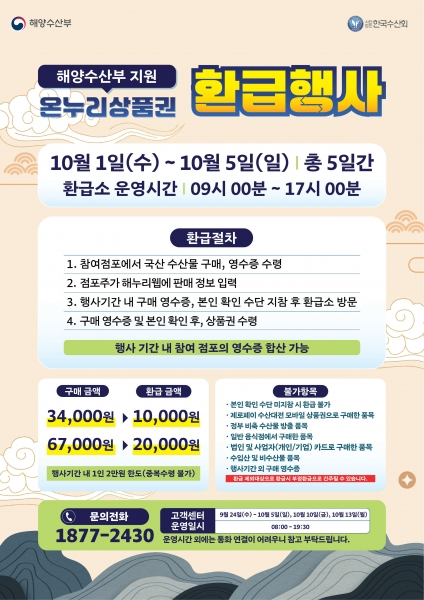 환급 기준은 △ 3만4천원 이상~6만7천원 미만 구매 시 1만원, △ 6만7천원 이상 구매 시 2만원이며 1인 최대 2만원 한도로 지원된다.