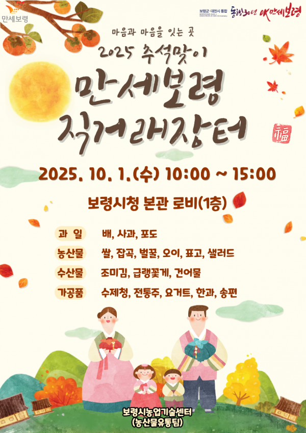 [충청25시] 보령시는 추석을 맞아 10월 1일 보령시청 본관 1층 로비에서 ‘2025 추석맞이 만세보령 농특산물 직거래장터’를 운영한다고 밝혔다.