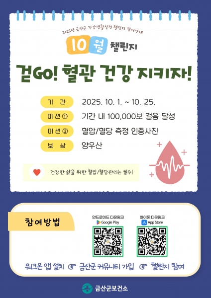 [충청25시] 금산군보건소는 사진인증으로 함께하는 2025 건강생활실천 ‘걷고 혈관 건강 지키자’ 챌린지를 오는 25일까지 진행한다.