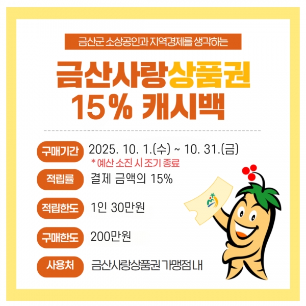 [충청25시] 금산군은 지역 상권에 활기를 불어넣기 위해 9월부터 적용한 금산사랑상품권 캐시백 적립률 15%를 10월에도 유지한다.