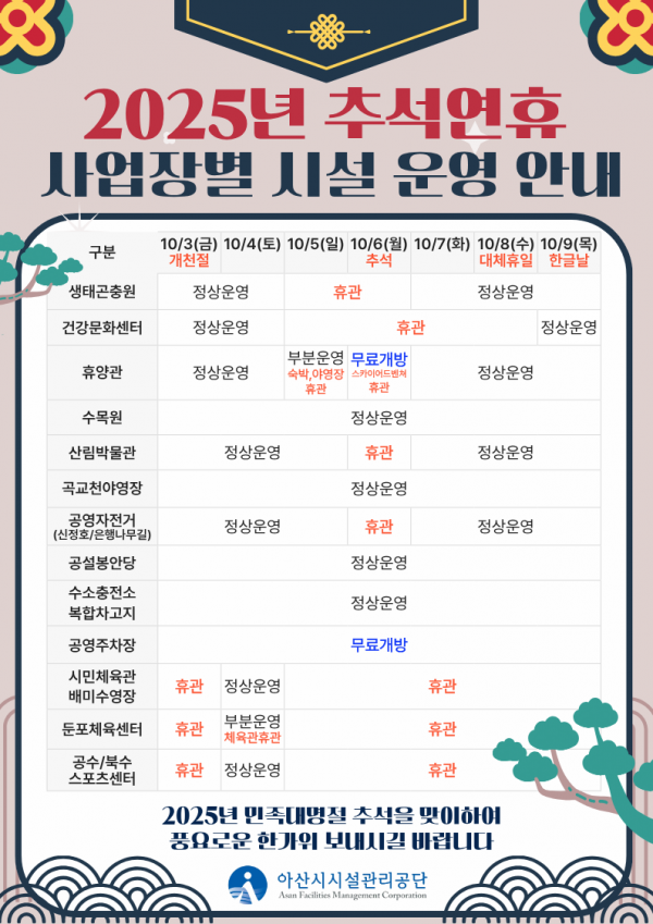 [충청25시] 아산시시설관리공단은 민족 대명절인 추석 연휴를 맞아 시민들이 안전하고 편안하게 공단 운영 시설물을 이용할 수 있도록 사업장별 운영 일정을 안내하고 연휴기간 중 안전관리에 만전을 기할 계획이다.