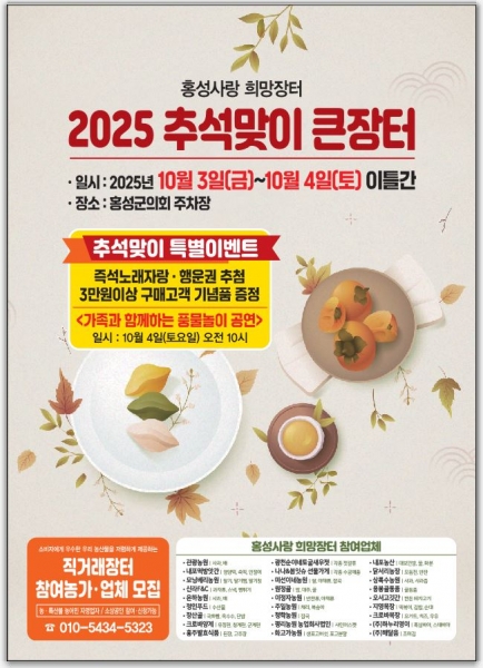 [충청25시] 홍성군은 추석 명절을 맞아 오는 10월 3일부터 4일까지 이틀간 홍주읍성 일원에서 농특산물 정례 직거래장터 ‘홍성사랑 희망장터’를 운영한다.