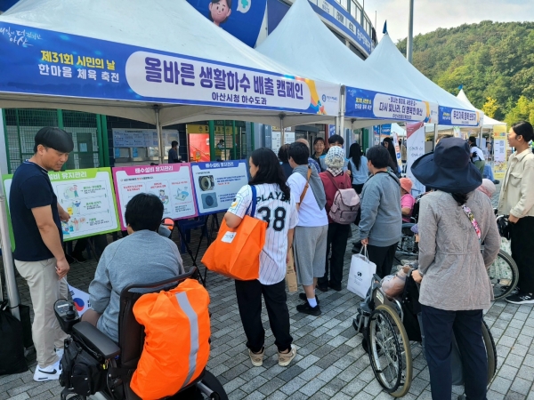 [충청25시] 아산시 수도사업소는 지난 1일 개최된 제31회 시민의 날 한마음 체육축전 현장에서 ‘올바른 생활하수 배출 캠페인’을 진행하며 시민 참여를 독려하고 생활환경 보호의 중요성을 알렸다.