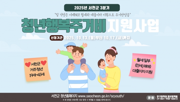 [충청25시] 서천군이 오는 13일부터 17일까지 3분기 청년 행복 주거비를 신청·접수 받는다.