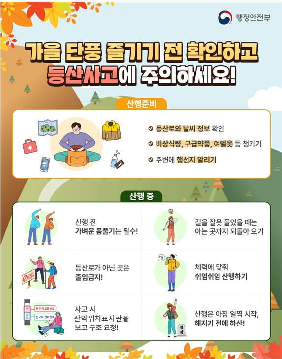 [충청25시] 행정안전부(장관 윤호중)는 가을 단풍철을 맞아 산행 시 실족이나 조난 등 안전사고 예방에 각별히 주의할 것을 당부했다.