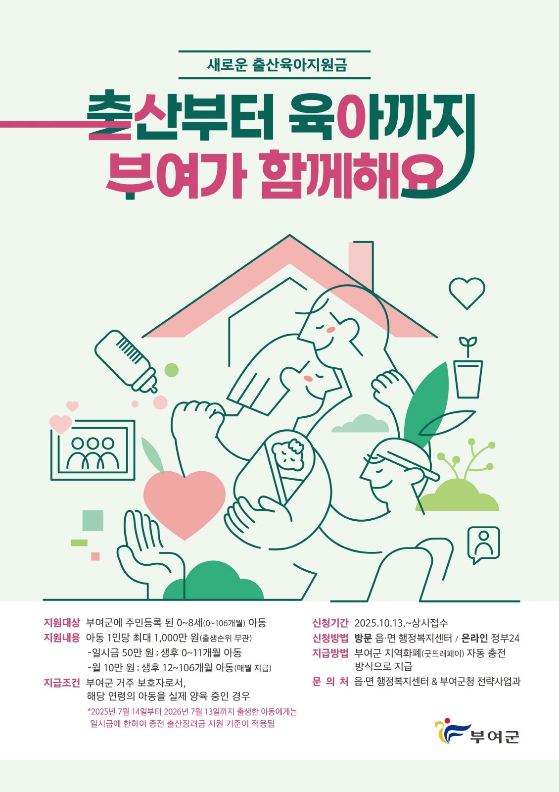 지원 대상은 부여군에 주민등록을 둔 0세부터 만 8세까지의 아동이다. 출생 직후에는 출생일로부터 11개월 이내의 영아를 양육 중인 보호자에게 일시금 50만 원을 지급하며, 이어 생후 12개월부터 만 8세 10개월(106개월)까지는 매월 10만 원씩 총 95개월간 분할 지급한다.