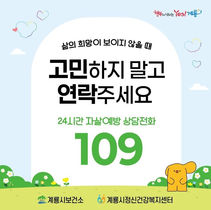 [충청25시] 계룡시(시장 이응우)는 ‘행복이 넘치는 Yes! 계룡’ 구현을 위해 건강하고 행복한 계룡시를 위한 다양한 자살 예방 사업을 펼치고 있다. 현대 사회는 빠른 변화와 복잡한 환경, 스트레스 증가 등의 요인들로 우울증 등 정신건강 문제가 지속적으로 발생되고 있다.