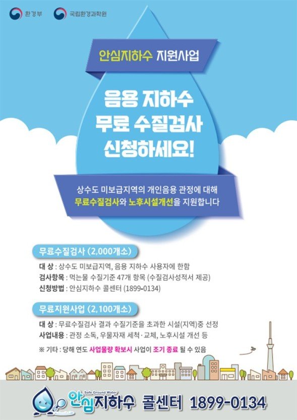 무료 수질검사를 희망하는 주민은 국립환경과학원(환경부 산하)에서 운영하는 ‘안심지하수 콜센터’를 통해 신청할 수 있다.