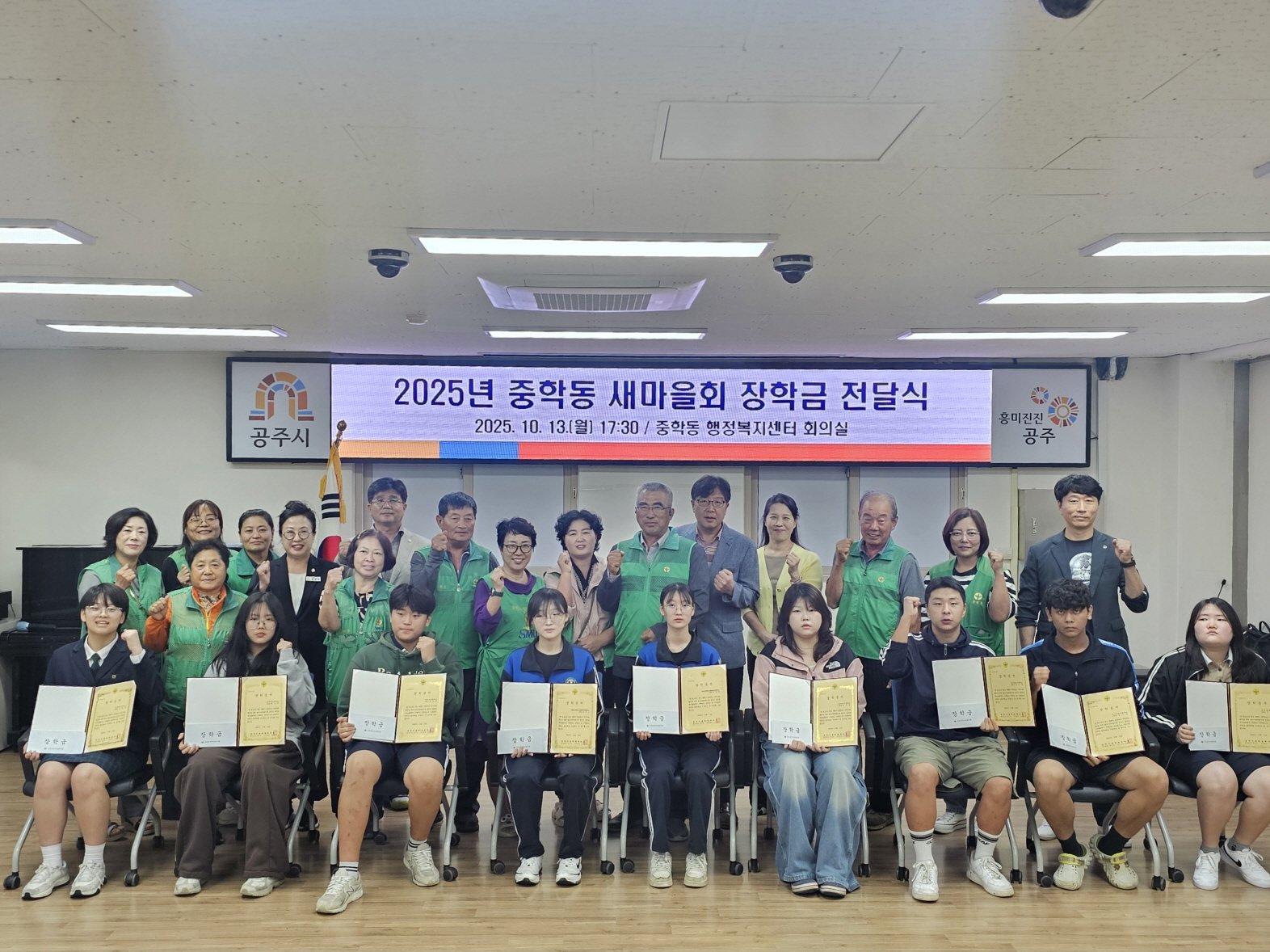[충청25시] 공주시 중학동 새마을회(협의회장 정인묵, 부녀회장 오연욱)는 지난 13일 중학동 행정복지센터에서 모범 청소년 10명에게 장학금을 전달했다.