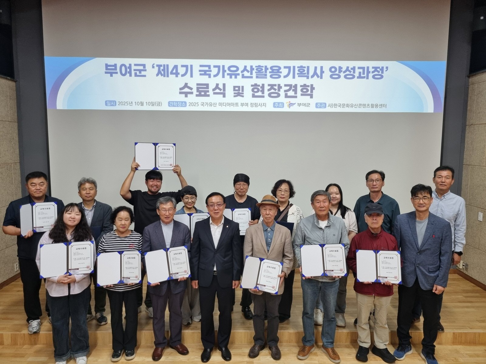 [충청25시] 부여군(군수 박정현)은 지난 10일 정림사지박물관에서 ‘제4기 국가유산활용기획사 양성 과정’의 수료식을 개최했다고 밝혔다.