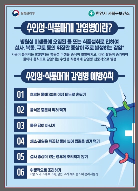 이에 시는 집단 식중독 발생에 신속하게 대응하기 위해 질병관리청, 충남도, 보건환경연구원과 협력체계를 유지, 수인성·식품매개 감염병 예방 및 확산 방지에 총력을 기울이고 있다.