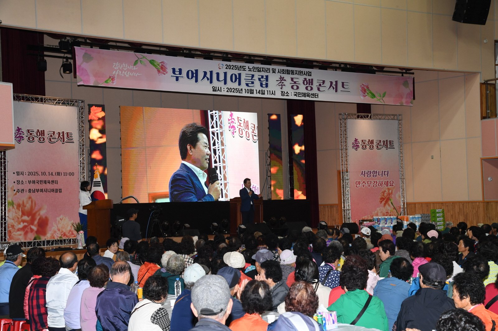 [충청25시] 부여시니어클럽은 지난 14일 부여국민체육센터에서 노인일자리 및 사회활동 지원사업 참여 어르신 약 1,800명을 대상으로 문화 활동인 ‘孝 동행 콘서트’ 행사를 성황리에 개최했다.