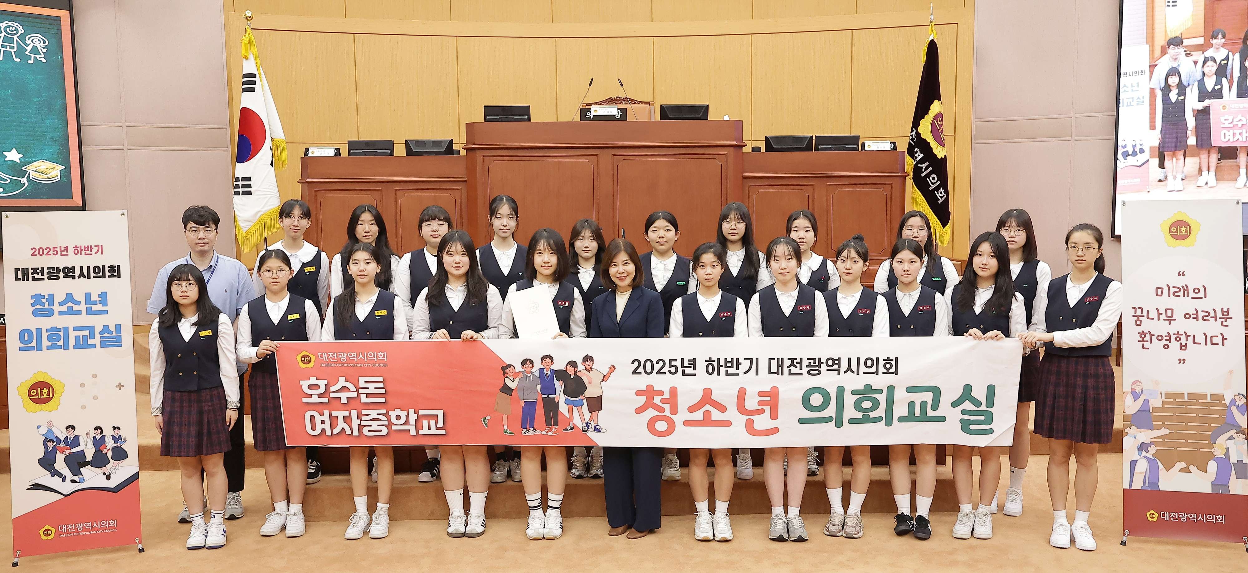 [충청25시] 호수돈여자중학교 학생들이 16일 대전시의회(의장 조원휘)를 방문해 하루 동안 시의회의 운영 과정을 직접 체험하는 뜻깊은 시간을 가졌다.