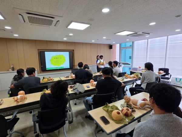 특히 예비아빠들이 직접 아기 모형을 안고 수유자세를 익히며 배우자와 함께하는 공동 육아의 중요성을 몸소 체험하는 시간이 됐다.